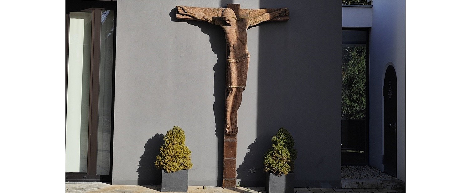 Ursprünglich stand das Kruzifix im Kirchraum, links an der Wand, nach der Sanierung und Umgestaltung des Kirchraums, hat es seinen Ort gut sichtbar auf dem Kirchen- Vorplatz gefunden.